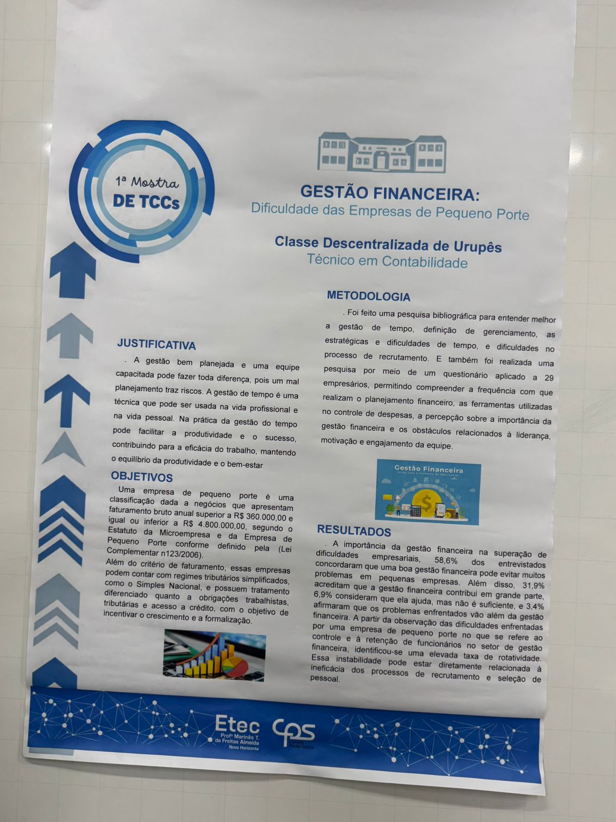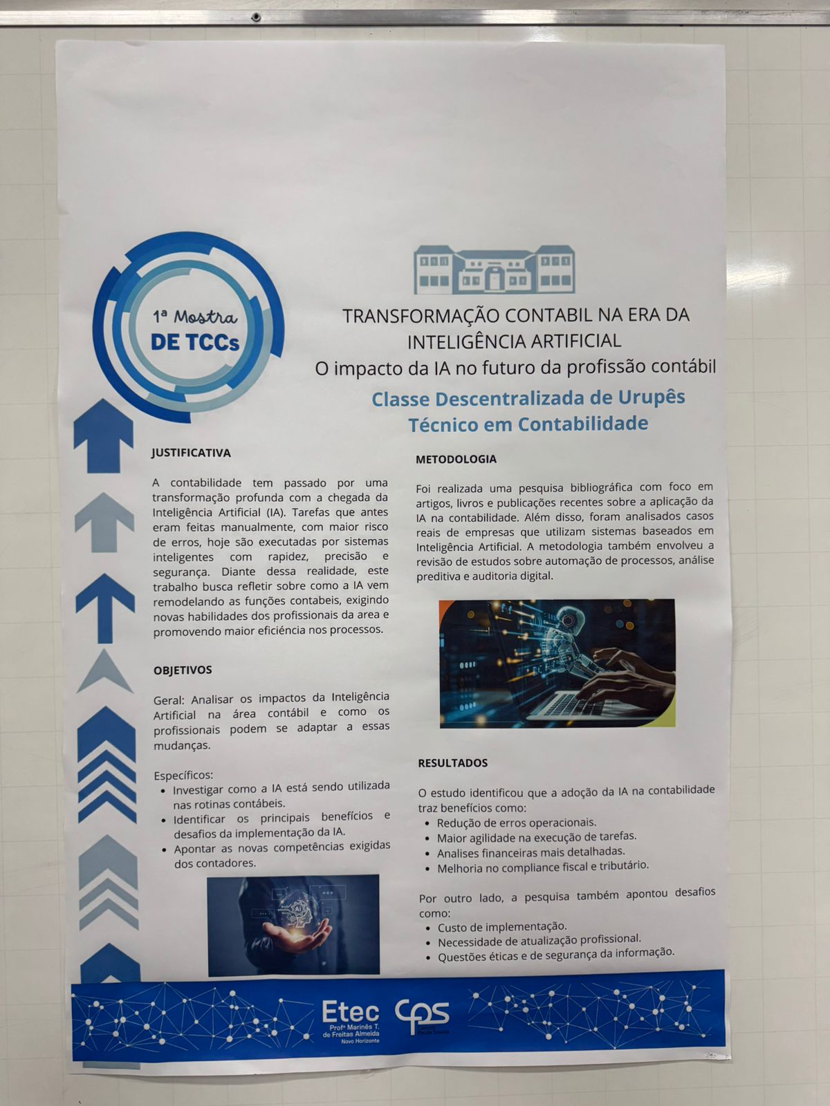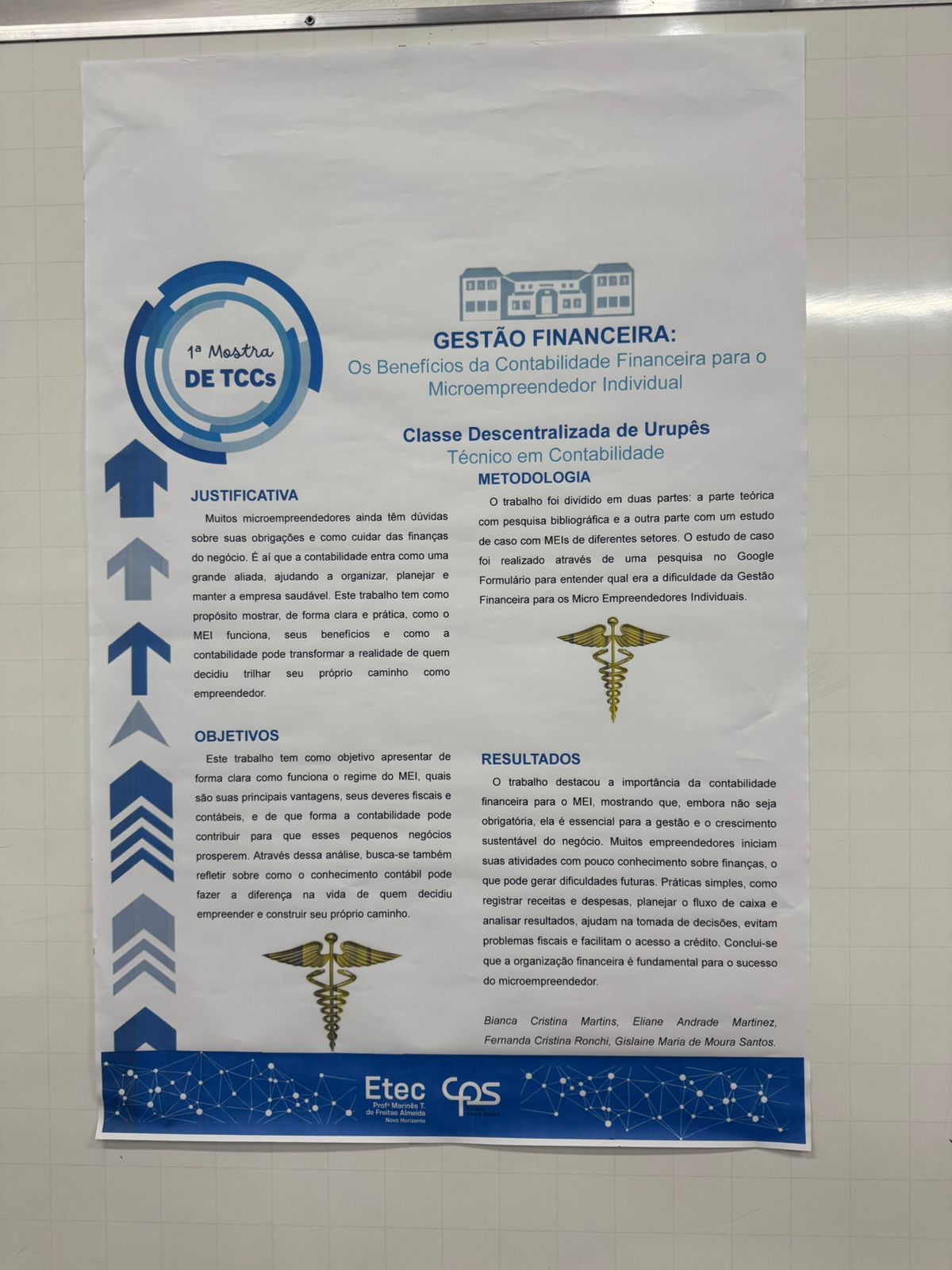 Urupês-SP. A ETEC de Novo Horizonte celebrou um marco importante na última terça-feira, 18 de junho, com a realização da I Mostra de TCCs da Classe Descentralizada de Urupês. Sob a competente coordenação da Professora Eliete Angela Roman Duarte, os alunos concluintes do curso técnico em Contabilidade tiveram a oportunidade de apresentar os banners de seus Trabalhos de Conclusão de Curso (TCCs), culminando em um evento que demonstrou a excelência e a relevância dos projetos desenvolvidos.