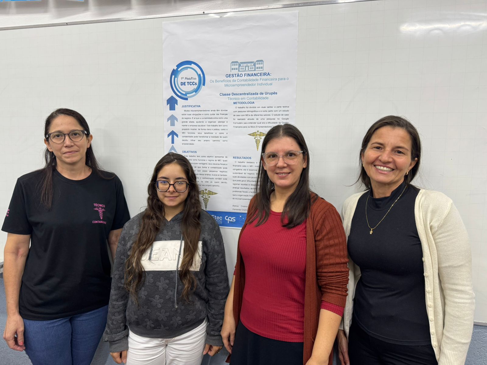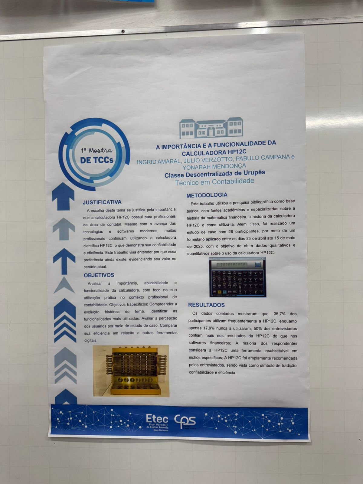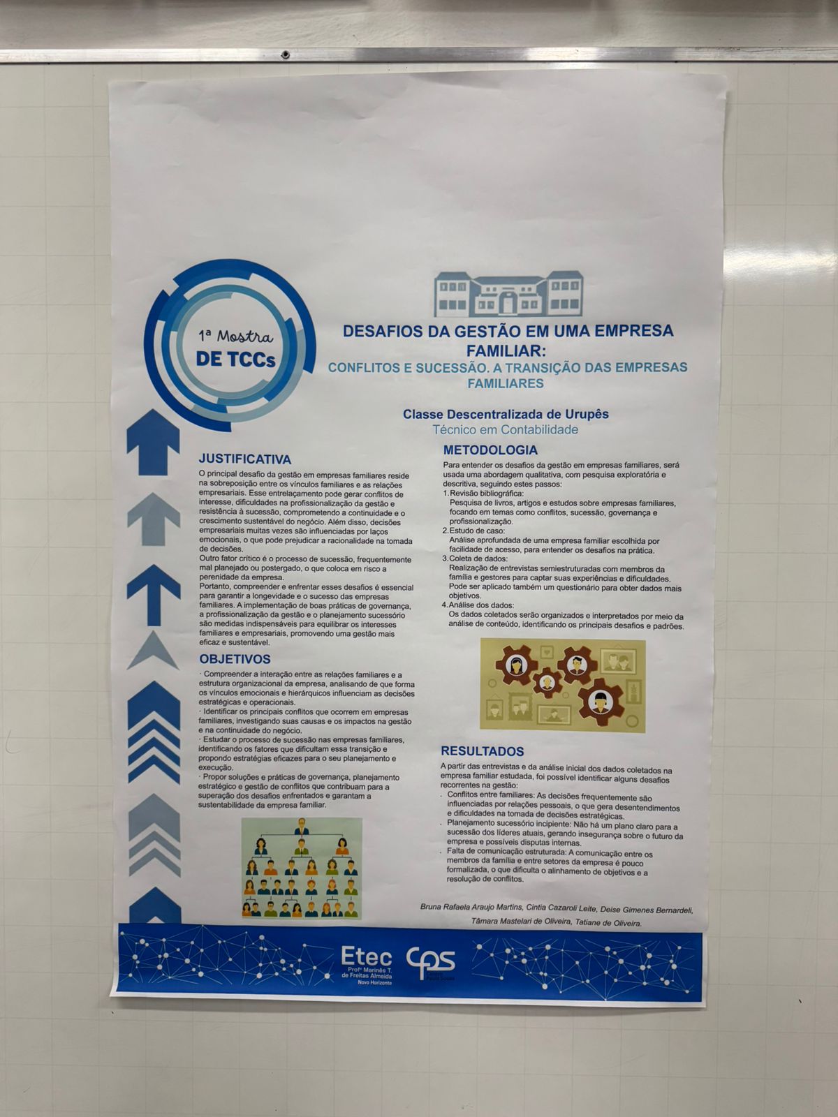 Urupês-SP. A ETEC de Novo Horizonte celebrou um marco importante na última terça-feira, 18 de junho, com a realização da I Mostra de TCCs da Classe Descentralizada de Urupês. Sob a competente coordenação da Professora Eliete Angela Roman Duarte, os alunos concluintes do curso técnico em Contabilidade tiveram a oportunidade de apresentar os banners de seus Trabalhos de Conclusão de Curso (TCCs), culminando em um evento que demonstrou a excelência e a relevância dos projetos desenvolvidos.